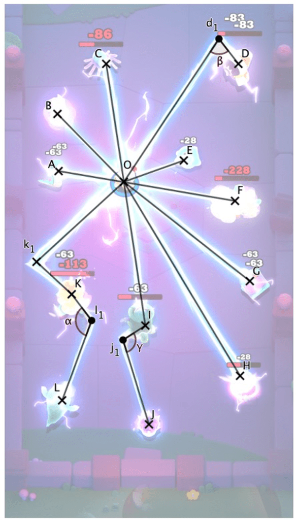 On regarde pour cela l’image en Annexe où l’on voit l’Archer Solitaire frapper ses 12 ennemis en un seul « tir multidirectionnel ». Pour faciliter notre étude, nous avons attribué à chaque monstre une lettre, de A à L, et l’Archer Solitaire est placé au point O, d’où l’on suppose que le tir multidirectionnel part. On remarque que les ennemis sont parfois touchés après des « rebonds », visibles aux points notés d1, j1, k1 et l1.