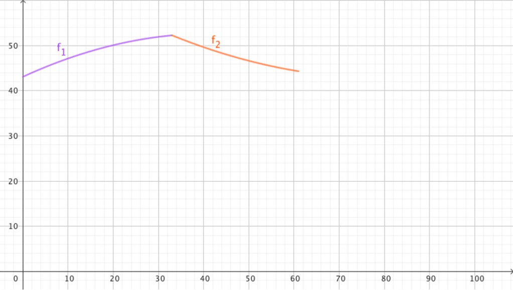 On étudie pour ce problème les évolutions de la population de l’Ukraine depuis 1960, date à laquelle les chiffres commencent à être disponibles auprès de la Banque Mondiale(1). A partir des données, il est possible d’observer que la population de l’Ukraine a suivi deux trajectoires majeures : l’une de croissance jusqu’en 1993, l’autre de décroissance de 1993 à 2022, année du début de la guerre. Considérons la fonction qui au temps t en années écoulées après 1960 (fin d’année) associe la population de l’Ukraine en millions.