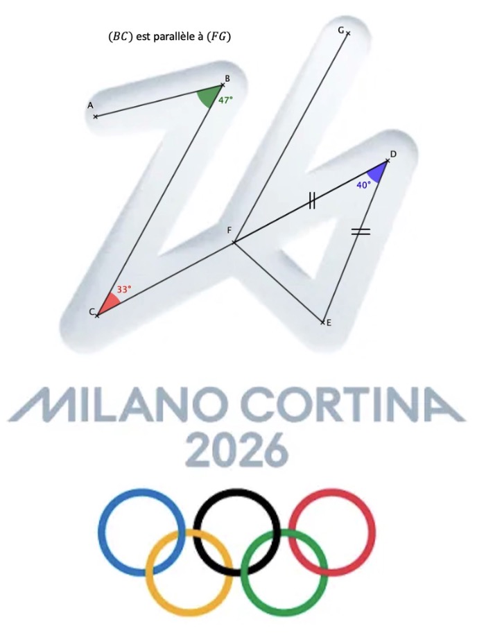 Pour ce problème, on se propose de « participer » mathématiquement à ces Jeux en calculant quelques angles autour de ce logo qui forme les chiffres 2 et 6 tracés d’un seul trait. Pour cela, on considère le « squelette » principal du logo qui est une ligne brisée ABCDEFG qui boucle sur elle-même pour fermer la boucle du chiffre 6. Représenté en Annexe, le squelette est tel que :