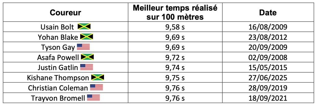 On a répertorié en Annexe les meilleures performances des 8 coureurs les plus rapides de tous les temps sur la distance, sachant que tous les temps sur 100 mètres sont mesurés électroniquement depuis 1968 au centième de seconde près.